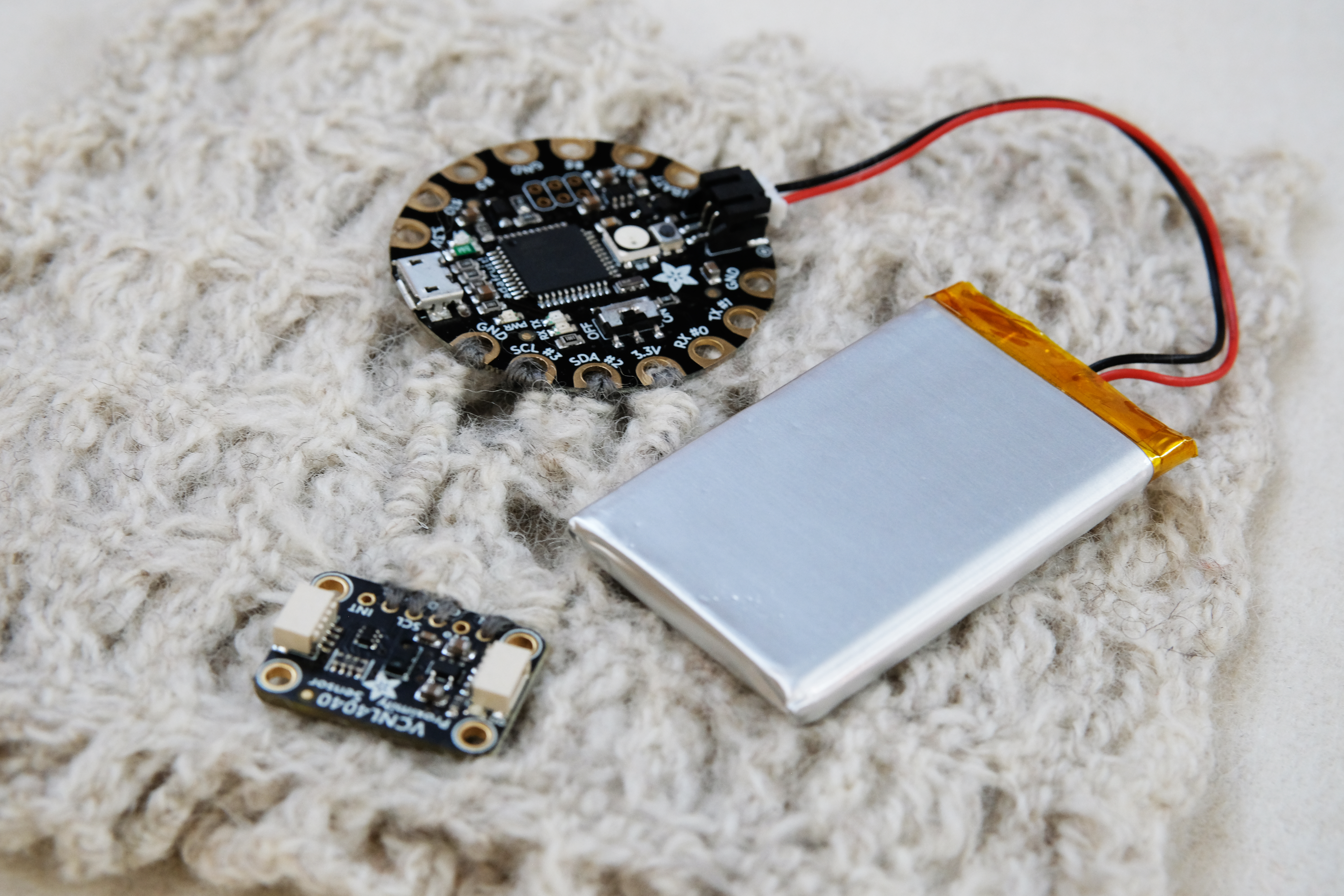 The sweater contains a detachable “patch,” knitted using hand manipulated stitches that produce a 3D ruching effect. The patch contains a proximity sensor and battery pack wired up to a FLORA, an Arduino-compatible microcontroller. The proximity sensor allows me to track my proximity to other bodies over time.